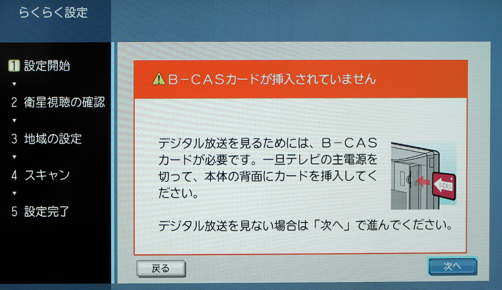 @地上デジタル放送のスキャンが行われていない状態では、以下のメッセージが画面に出ます。![]() Aリモコン又は本体側面のメニューボタンで設定に入ります。 ![]() B設定→初期設定→らくらく設定 へ進みます。 ![]() CB-CASカードが正しい方向で挿入されていない場合は警告が出ますので、方向を確認して刺し直します。 ![]() D衛星放送を「視聴する」に設定します。 ![]() Eアンテナ電源の供給方法を選択します(お住まいの環境により異なります。当社商品は主に「テレビ連動」で設定してあります。) ![]() F郵便番号を設定します。 ![]() G地上デジタル放送を「視聴する」に設定します。 ![]() H地上デジタル放送のスキャンが始りますので、2分ほどお待ちください。 ![]() 以上で設定は終了です。 |