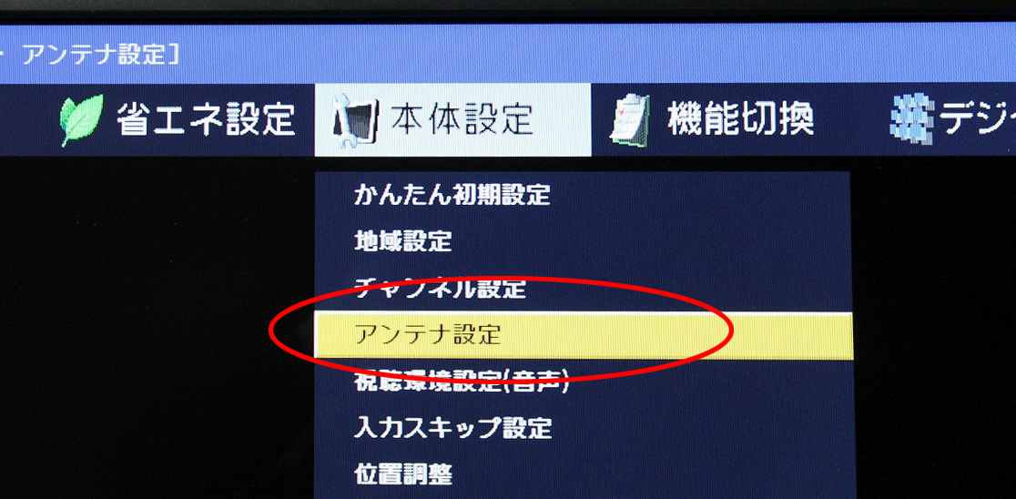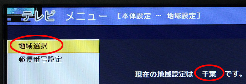 @リモコンのメニュー(ホーム)ボタンで本体設定→かんたん初期設定へ![]() A地域選択メニューへ(当社の商品は主に千葉に設定されています) ![]() B地域設定から地域および都道府県を設定 ![]() C郵便番号を設定 ![]() Dチャンネル設定(地上デジタル放送波をスキャンします) ![]() Eアンテナ設定で、アンテナに電源を供給するかどうかを設定します ![]() |